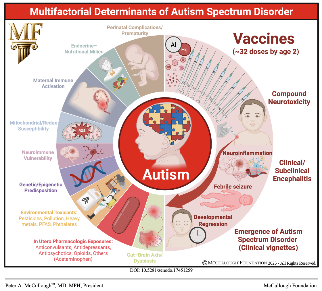 The McCullough Foundation’s report summarizing its analysis of over 300 studies on known risk factors on the causes of Autism Spectrum Disorder (ASD) has concluded that one factor – “combination and early-timed vaccination” in infants and children – is the major driver of risk for ASD. While other non-vaccine factors that parents have heard about for years – including being older parents, having had premature delivery, genetic predisposition, pre-birth drug exposure, and environmental toxins – have contributed to the sharp rise in autism in the United States, only combination and early-timed vaccination has emerged as the dominant catalyst of risk, “consistent across mechanistic, epidemiologic, and clinical evidence,” say authors, Nicolas Hulscher, MPH, et al in the report released today.