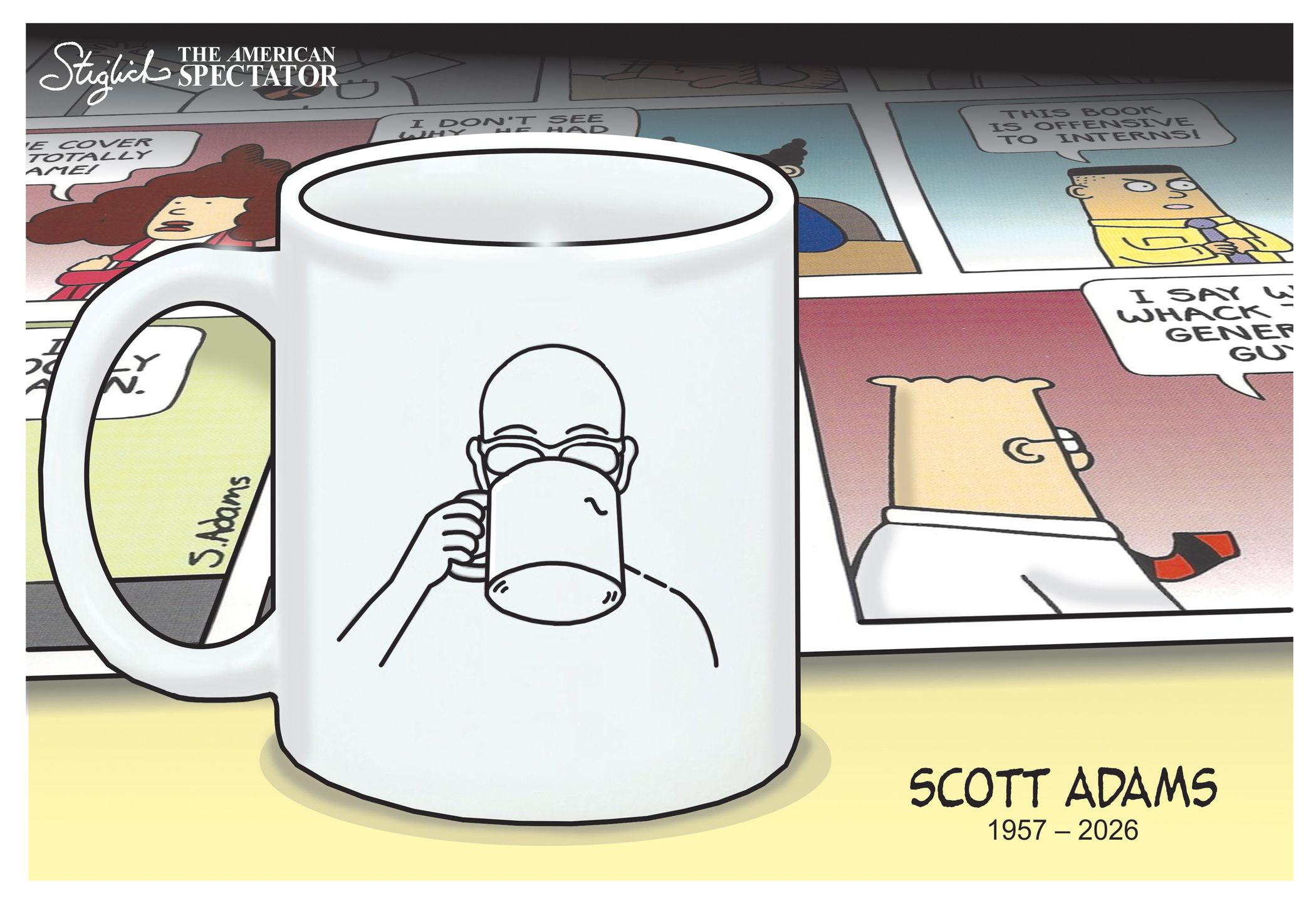 “RIP Scott Adams,” editorial cartoon by Tom Stiglich for The American Spectator on Jan. 14, 2026....