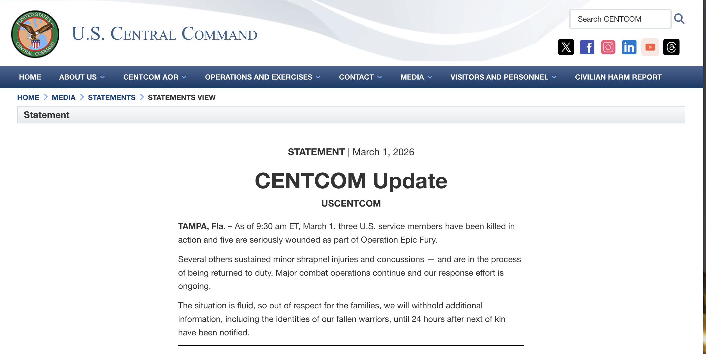3 US Service Members Killed, Five Seriously Wounded In Operation Epic Fury